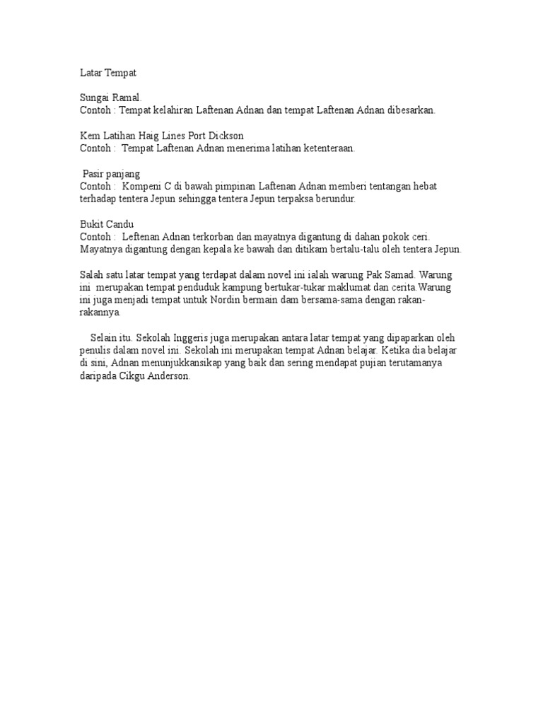 Berdasarkan sebuah novel yang telah saya pelajari iaitu novel leftenan adnan wira bangsa karya abdul latip bin talib, terdapat beberapa latar tempat dalam novel ini. Leftenan adnan is a 2000 malaysian war film directed by aziz m. Latar tempat, latar masa, latar masyarakat (novel tingkatan 4). Berdasarkan sebuah novel yang anda pelajari,jelaskan dua latar tempat yang terdapat dalam novel tersebut. Nota novel latar tempat latar masa dan watak sampingan latar tempat 1 warung kopi pak samad contohnya warung kopi pak samad terletak di persimpangan course hero.
