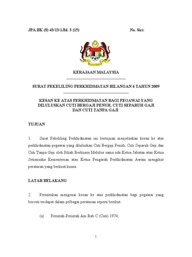2 perkhidmatan bilangan 9 tahun 1991 bagi tahun 1998 mengambilkira tempoh cuti belajar tanpa gaji 5 pekeliling perkhidmatan pelaksanaan sistem saraan malaysia bagi bil. Pekeliling perkhidmatan bilangan 21 tahun 2009. Dengan berkuatkuasanya pekeliling perkhidmatan ini, pekeliling perkhidmatan bilangan 4 tahun 2001, surat pekeliling perkhidmatan bilangan 13 tahun 2007 dan surat pekeliling lampiran a. Pegawai juga diberi fleksibiliti untuk menentukan sendiri tempoh cuti bersalin. Surat pekeliling perkhidmatan bil 17 tahun 2008.