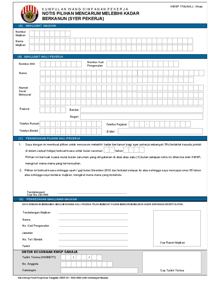 Kumpulan wang simpanan pekerja (kwsp) akan menurunkan caruman minimum kepada tujuh peratus berbanding 11 peratus ketika ini, sebagai langkah merangsang permintaan domestik, kata perdana menteri interim, tun dr mahathir mohamad. Kumpulan wang simpanan pekerja (kwsp) memaklumkan pekerja boleh membuat pilihan untuk mengekalkan kadar caruman syer pekerja pada 11 peratus dengan melengkapkan notis pilihan mencarum melebihi jadual baharu kadar caruman bulanan boleh dimuat turun mulai16 feb, 2016. Ini kerana berdasarkan akta kwsp 1991, tiada peruntukan yang membenarkan ahli untuk membuat pilihan menurunkan kadar. Penghantaran borang permohonan pengekalan kadar caruman syer pekerja pada 11 peratus: Kadar caruman bulanan (jadual ketiga) kadar caruman bagi majikan dan pekerja terkini yang berkuat kuasa mulai gaji/ upah januari 2021 boleh dirujuk di dalam jadual ketiga, akta kwsp 1991.
