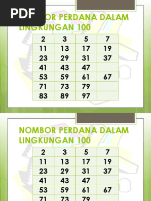 4 bukan nombor perdana kerana 4 boleh dibahagi 2. Alhamdulillah cgu linn berjaya menghasilkan video pembelajaran. Nombor bulat nombor perdana dalam lingkungan 100. Nombor bulat nombor perdana dalam lingkungan 100. Corak nombor yang menghubungkan satu nombor dengan nombor yang lain. (i) 2+3+7 (ii) 5 + 7 tips: Sepuluh nombor perdana yang pertama ialah 2, 3, 5, 7, 11, 13, 17, 19, 23 dan 29. Nombor perdana 1 hingga 100 tahun 6подробнее. Nombor perdana (prime number) adalah nombor bulat yang hanya boleh dibahagikan dengan dirinya sendiri dan nombor 1 (the number itself and number 1). Saya akan menunjukkan kepada anda semua. 4 bukan nombor perdana kerana 4 boleh dibahagi 2. Ada 20 gudang lagu matematik tahun 6 memahami nombor perdana terbaru, klik salah satu untuk download lagu mudah dan cepat. More documents from kho ling hong.